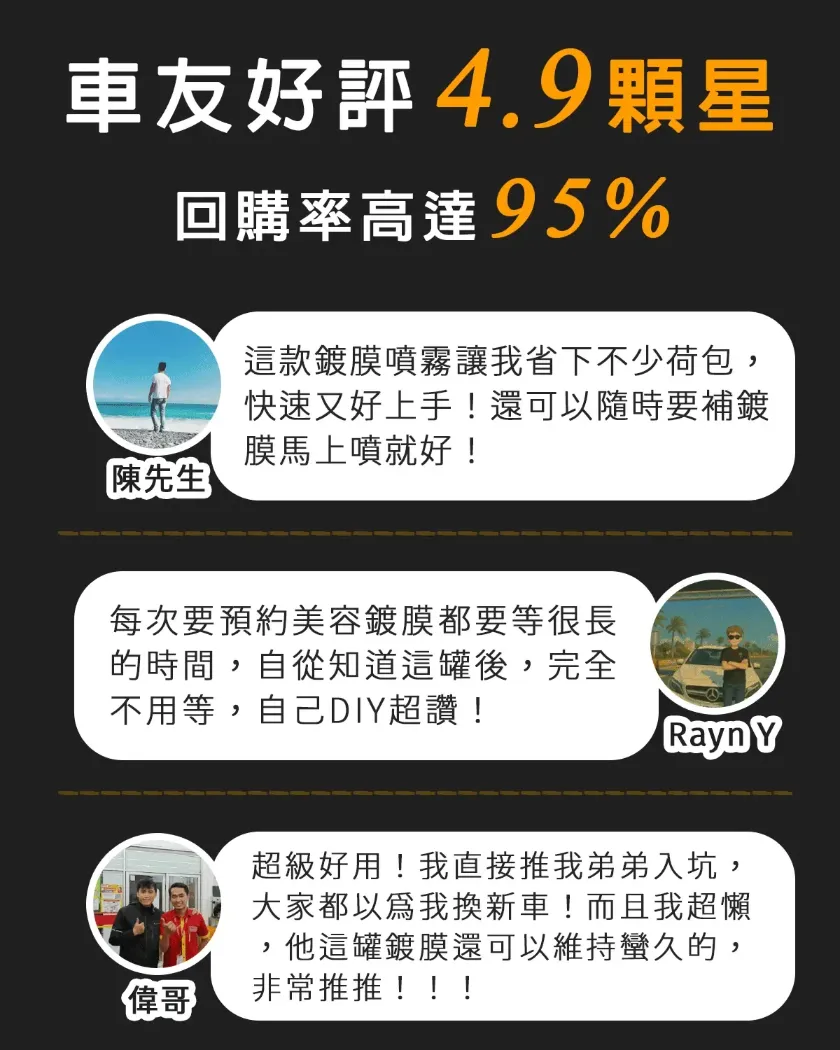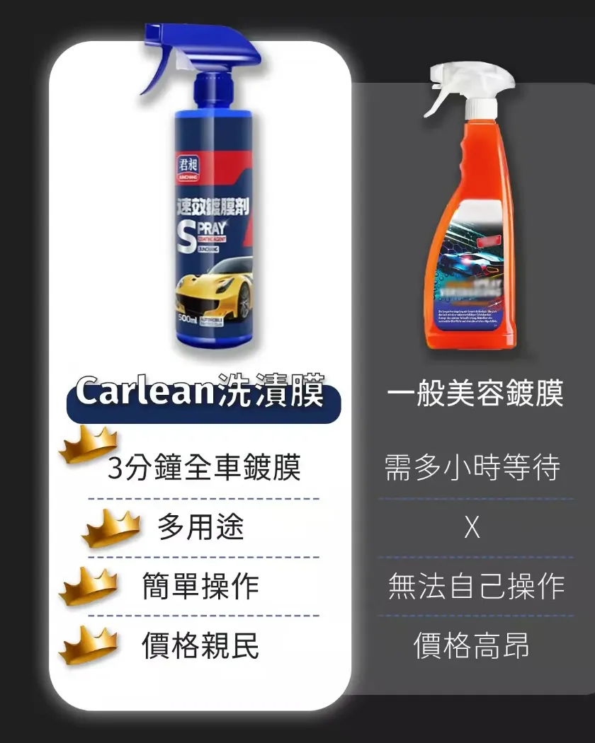 以前都覺得鍍膜很麻煩,現在一瓶搞定,老公都問我是不是偷偷送車去保養了!一噴一擦,5分鐘快速鍍膜 🔹 有效防水、防污、抗刮痕 🔹 超亮光感,車子瞬間像新的一樣